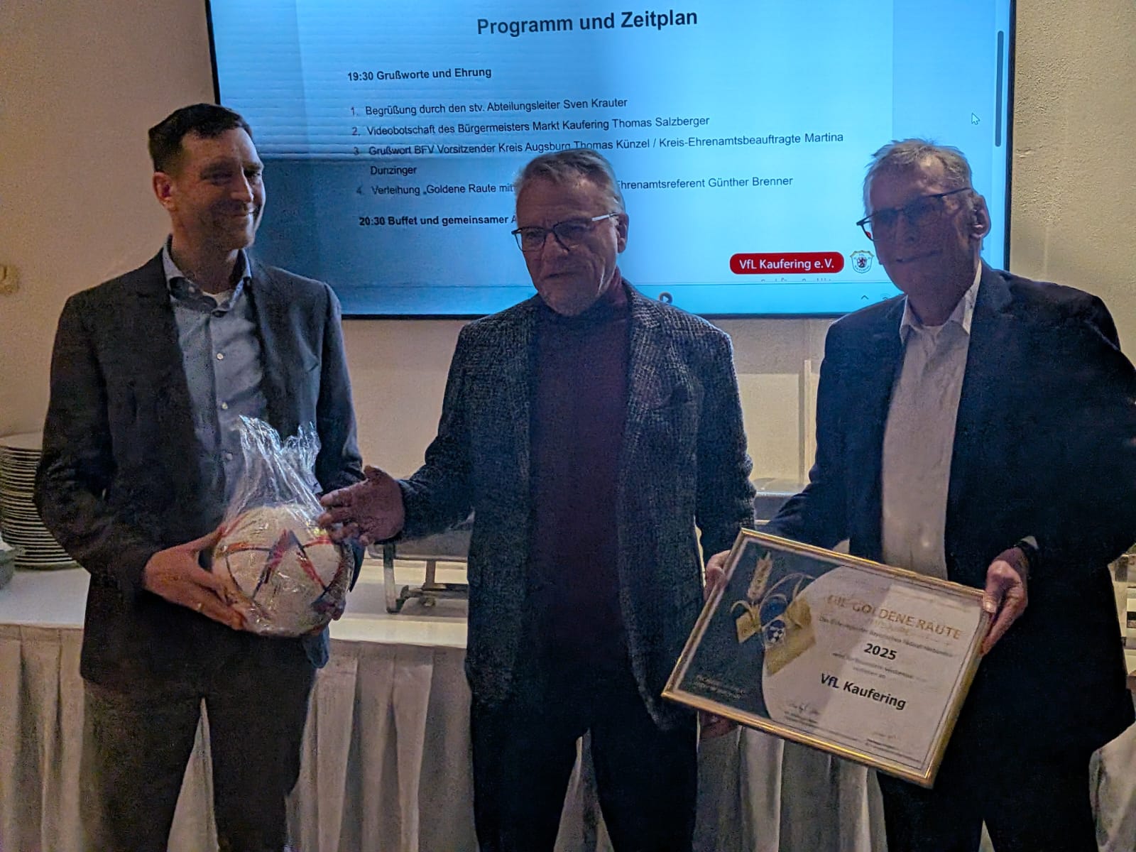 Bürgermeister Thomas Salzberger lobte in seiner Videobotschaft das langjährige Engagement des VfL Kaufering und die hervorragende Jugendarbeit durch die Abteilung Fußball. Auch Marktgemeinderätin und Landtagsabgeordnete Gabriele Triebel war sichtlich stolz auf die Ehrung ihres Heimatvereins und wies auf die wichtige gesellschaftliche Funktion des Vereins und seiner zahlreichen ehrenamtlichen Helfer hin. Höhepunkt des Abends war die Verleihung der Ehrenurkunde „Goldene Raute mit Ähre“ durch den Bezirks-Ehrenamtsreferent Günther Brenner an Abteilungsleiter Sven Krauter und den Vereinsehrenamtsbeauftragten Erich Krauter.